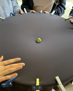 Poi, posiziona una palla più pesante al centro del tessuto per creare una curvatura. Fai rotolare di nuovo la pallina leggera: questa volta, invece di andare dritta, girerà intorno alla palla pesante seguendo un percorso curvo o ellittico. Questo dimostra come oggetti più piccoli (come una luna, un pianeta o la luce) siano influenzati dalla gravità di corpi più grandi (come la Terra, il Sole o un buco nero) quando si avvicinano abbastanza.