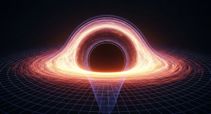 Figura 1: Il modello di un buco nero che mostra come il percorso della luce venga modificato a causa della sua immensa gravità.