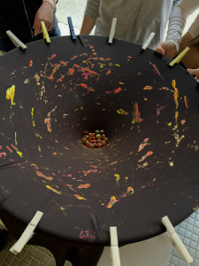 Immergi alcune delle palline piccole nella tempera o in un colore liquido, poi posizionale sul tessuto teso. Spingile con una certa forza per metterle in movimento. Mentre si muovono attorno al “buco nero” centrale (la palla pesante), lasceranno delle scie curve di vernice che imitano i percorsi gravitazionali della luce o della materia attorno a un vero buco nero. Ripeti il procedimento più volte; sia tu che i partecipanti potete alternarvi. Con il tempo, le scie sovrapposte formeranno un disegno (Figura 6) ad anello simile all’iconico bagliore visto nell’immagine del 2019 del Telescopio Event Horizon.