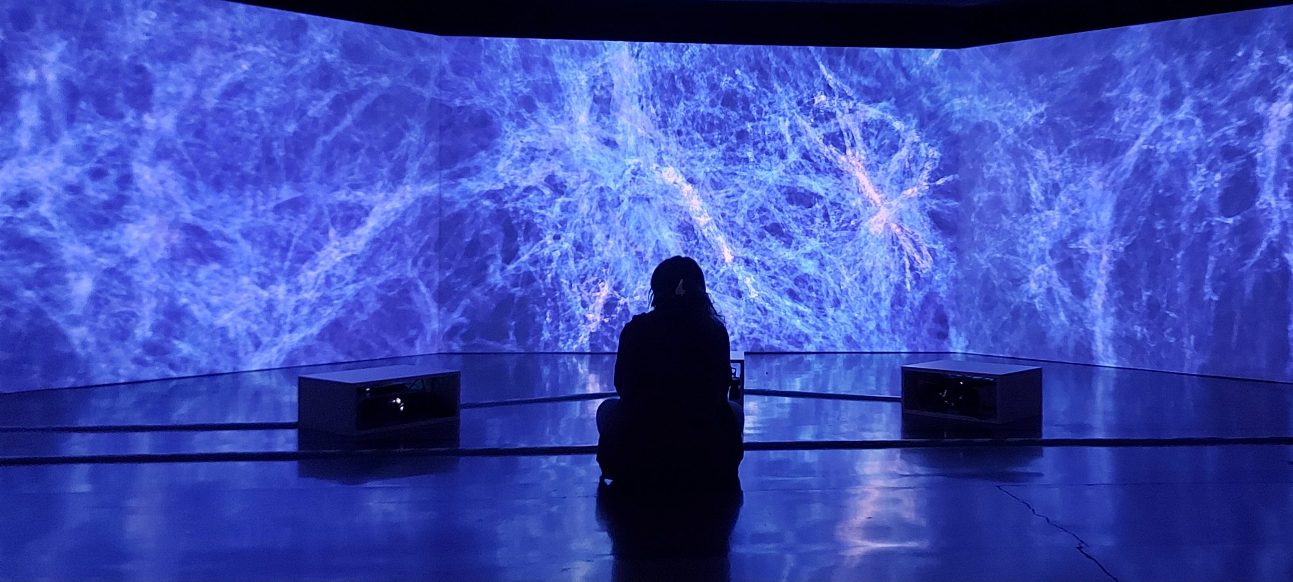 Benvenute e benvenuti in questo viaggio, che dai confini remoti dell’universo ci porterà verso il pianeta che chiamiamo “casa”: la Terra. Davanti a voi potete osservare una piccola porzione del cosmo in cui viviamo: un cubo i cui lati misurano 350 milioni di anni luce. Sembra una distanza enorme, ma l’intero universo è molto, molto più grande. Quella specie di ragnatela è la materia oscura, qui resa visibile artificialmente. Rappresenta la quasi totalità della materia dell’Universo e forma una rete cosmica di lunghissimi filamenti che ospitano migliaia di galassie. Dove i filamenti si intersecano, prendono forma giganteschi ammassi di galassie. Anche noi ci troviamo su uno di questi filamenti. Ora spegniamo la materia oscura, per ammirare l’Universo così come appare ai nostri occhi, attraverso quel piccolo 5% di materia che interagisce con la luce.